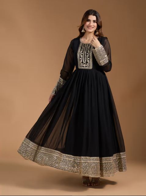 Women's Georgette Embroidery Black Color Anarkali Kurta With Dupatta Pant Not Available
