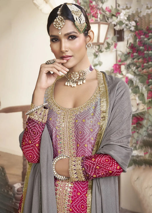 Women's Chinon Silk Embroidery PIink-Grey Color Kurta Sharara With Dupatta