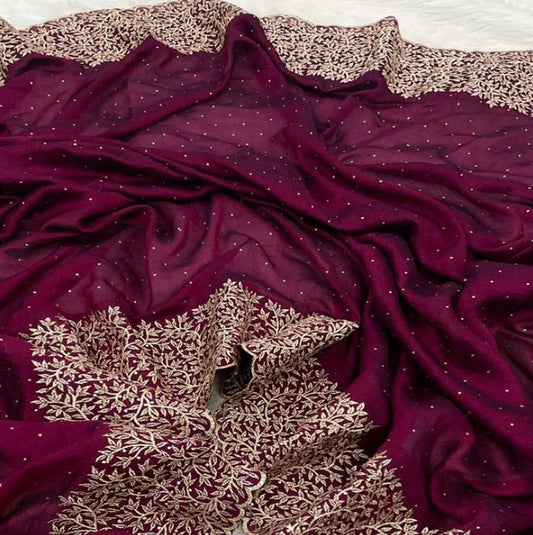 Women's Embroidery Georgette Purple Color Saree With Unstitch Dhupian Silk Blouse