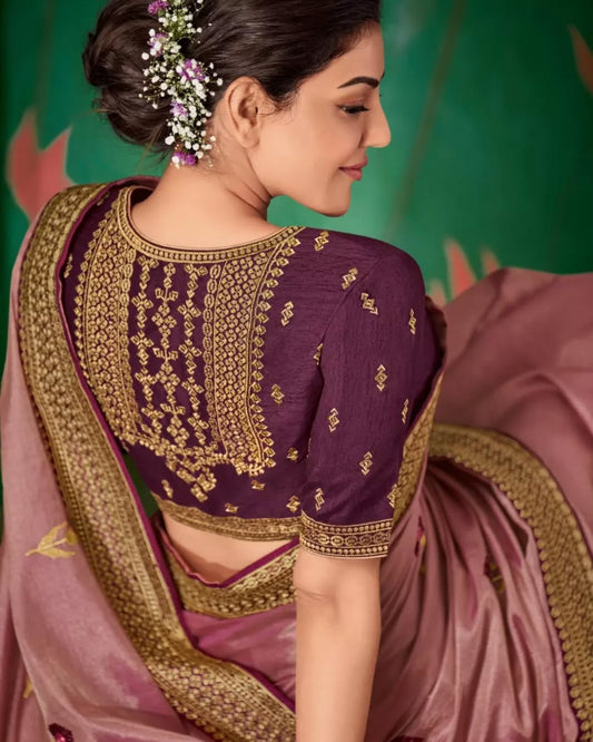 Women's Printed Embroidery Organza Purple Colour Saree With Unstitch Dhupian Silk Blouse Pcs