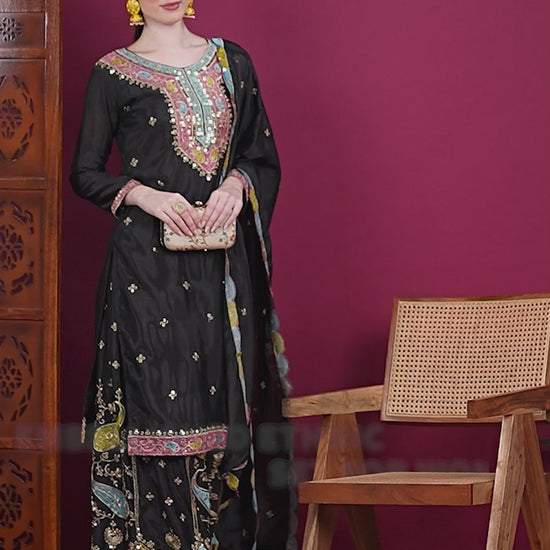 Women's Chinon Silk Embroidery Black Color Kurta Sharara With Dupatta