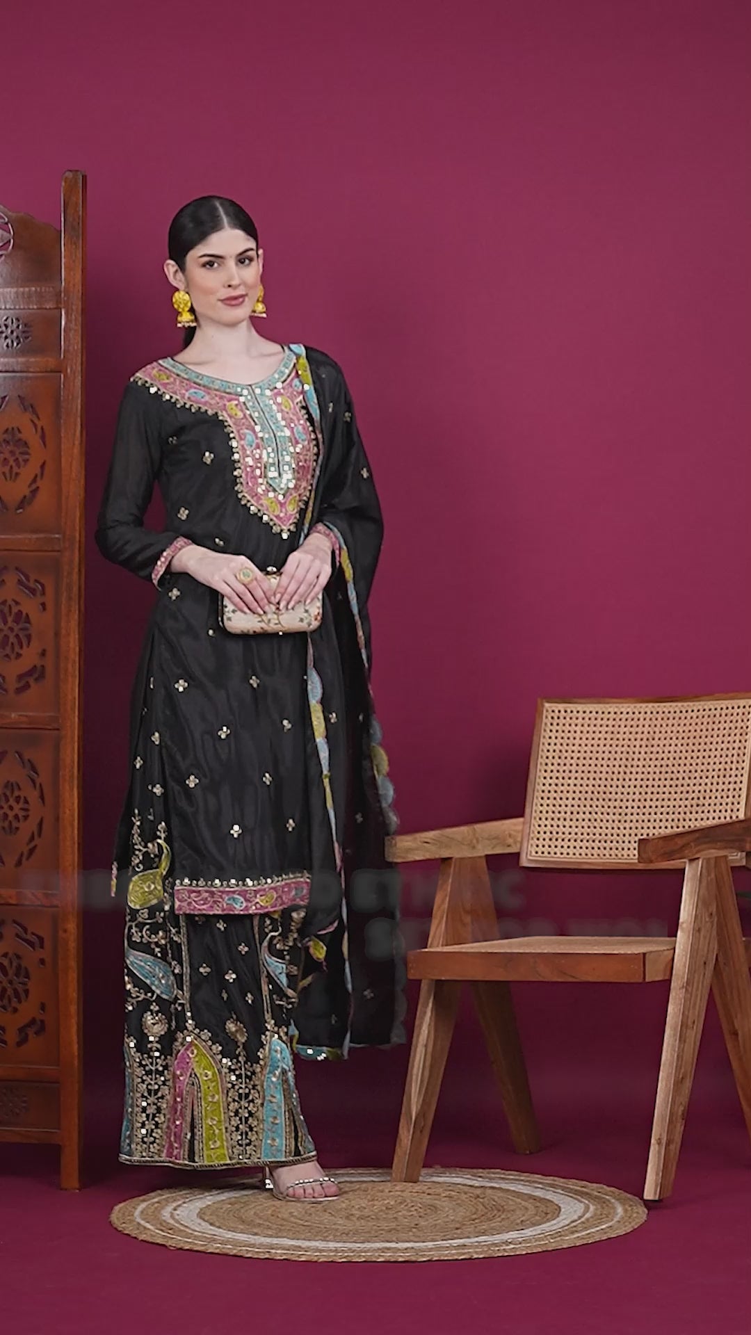 This elegant women's set features a Black Chinnon Silk kurta adorned with intricate embroidery, paired with matching pants and a coordinating dupatta. The lightweight Chinnon Silk fabric ensures comfort and graceful drape, while the detailed embroidery adds a refined touch suitable for festive occasions or formal gatherings. Designed to offer both style and ease, this ensemble combines traditional craftsmanship with contemporary appeal.