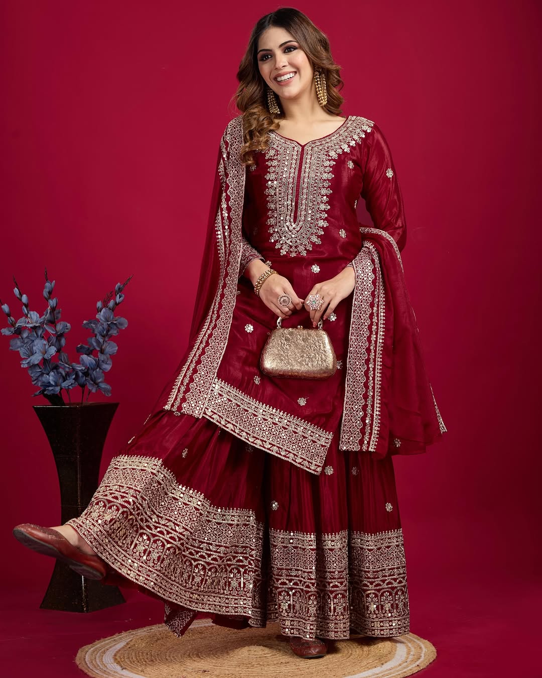 Women's Chinon Silk Embroidery Red Color Kurta Sharara With Dupatta