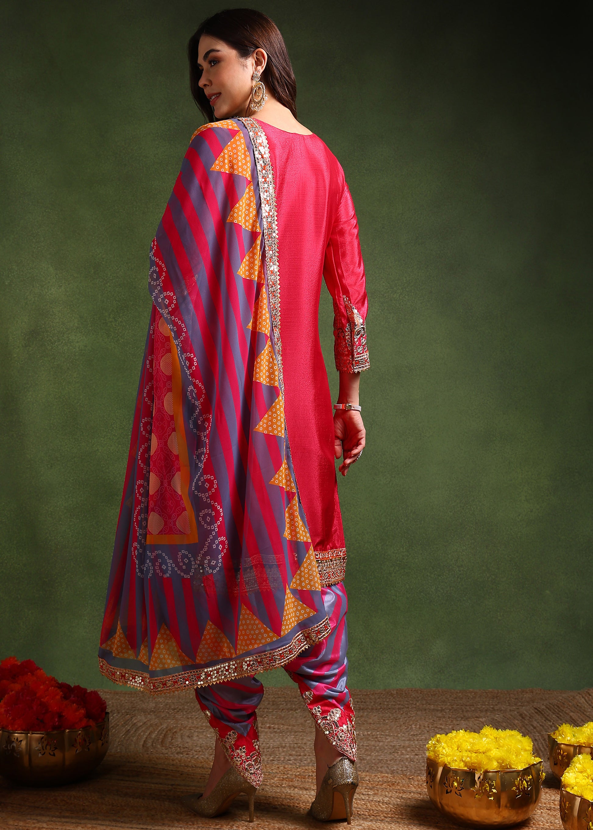 Women's Chinon Silk Embroidery Pink Color Kurta Dhoti Pant With Dupatta