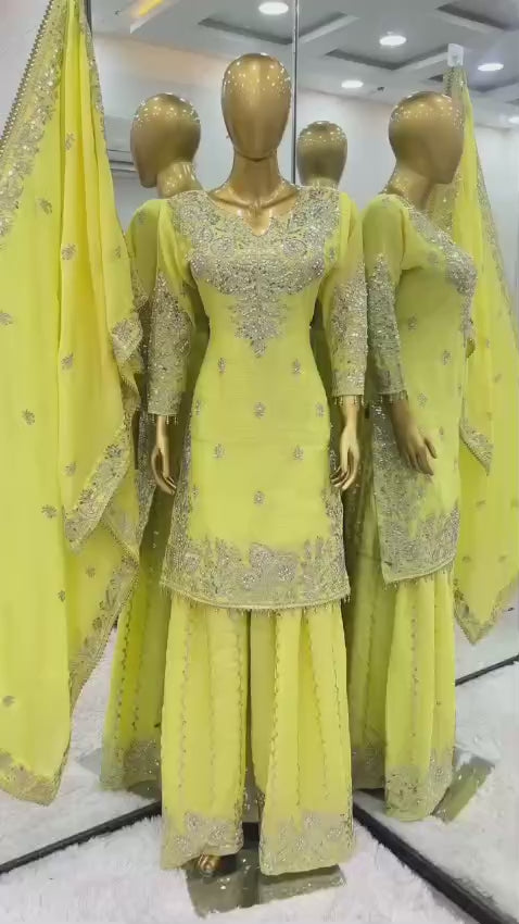 Women's Chinon Silk Embroidery Yellow Color Kurta Sharara With Dupatta