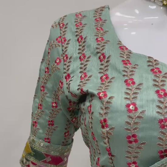 Elevate your ethnic wardrobe with this exquisite green organza saree featuring intricate embroidery that adds a touch of elegance and sophistication. Crafted from lightweight organza fabric, it offers a graceful drape and comfortable wear for special occasions. The saree comes with an unstitched blouse piece, allowing you to customize the fit and style to your preference. Perfect for festive events and celebrations, this saree combines traditional craftsmanship with contemporary appeal.